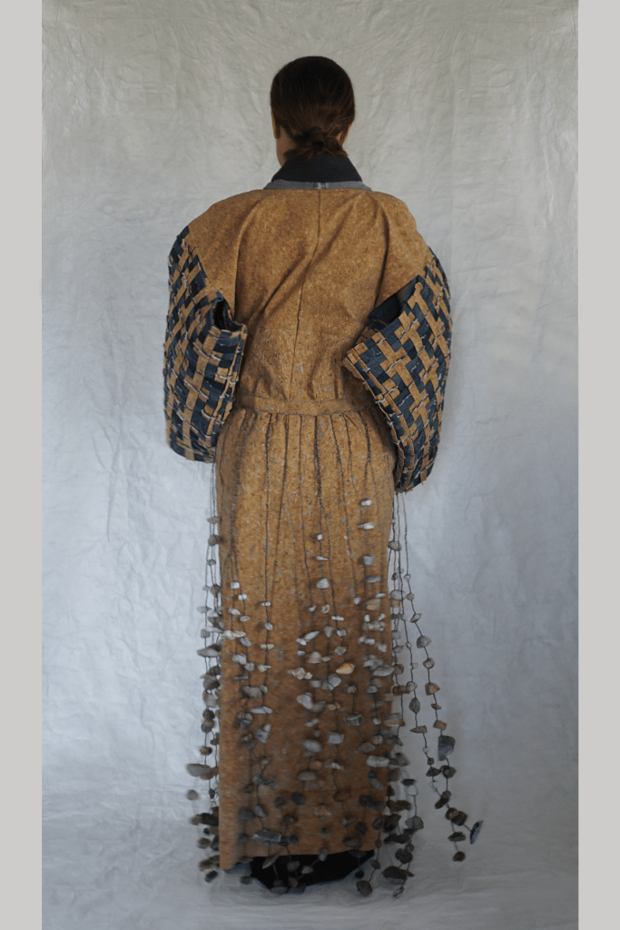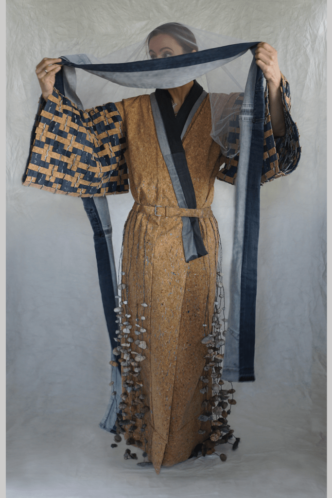 cork fabric, jeans, thread, hair, paint, metal, stones, shells, feathers, beads